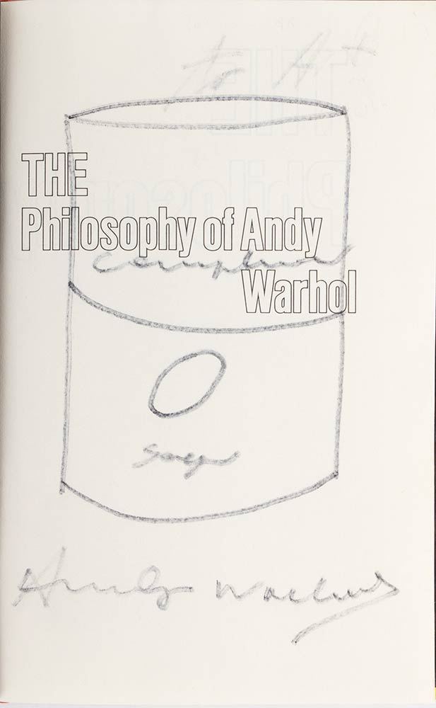 Dedica, disegno e firma nella prima pagina del libro: “To Art Campbell Soup, Andy Warhol “