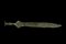 Spada a lingua da presa italica, impugnatura con margini rilevati per l'inserzione del pomo in materiale deperibile oggi scomparso, restano i rivetti di fermatura; lunga lama foliata con margini assottigliati