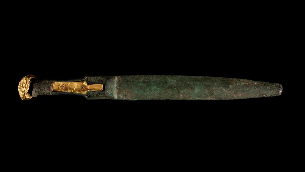 Spada in bronzo con impugnatura provvista di alloggi per l'inserimento di altro materiale, oggi con elementi in oro antichi decorati a rosette ma verosimilmente non pertinenti; lama foliata