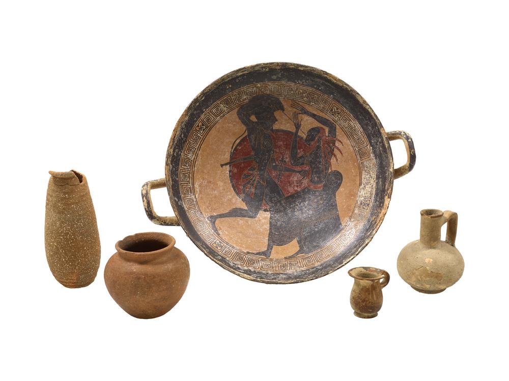 Una grande kylix in stile attico a figure nere su alto piede a tromba decorata esternamente con una teoria di cavalieri da un lato e da guerrieri armati sull'altro; all'interno scena di combattimento fra un uomo ed una lagynos con alto collo e corpo globulare, integra; un unguentario cilindrico lacunoso sulla bocca; un'olletta globulare con orlo estroflesso; un'olpe miniaturistica a vernice nera con orlo appiattito e corpo cilindrico, piede ad anello (5)