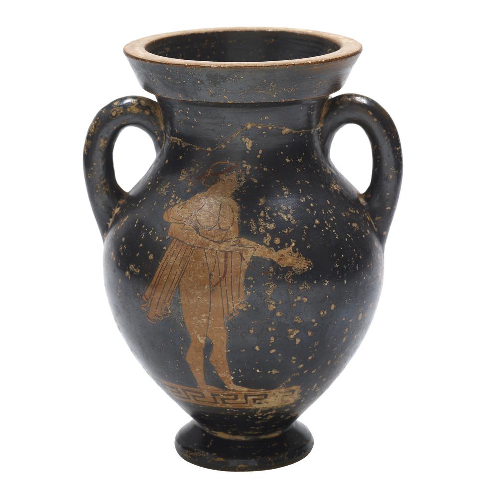 DECORAZIONE: su un lato figura maschile barbata avvolta nel mantello, volta a destra con una lancia in una mano ed un bastone nell'altra; sull'altro lato figura di efebo nudo gradiente a sinistra con le braccia protese ed una tenia nei capelli col mantello drappeggiato sulle spalle
