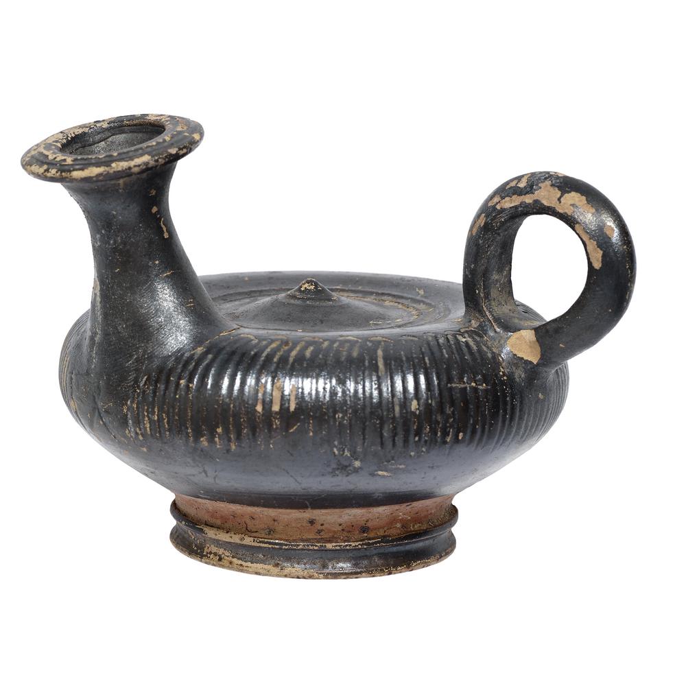 Guttus con alto piede cilindrico sagomato, serbatoio globulare schiacciato decorato da sottili striature verticali, alto bocchello lievemente obliquo con orlo estroflesso scanalato, ansa ad anello verticale, sul serbatoio apofisi conica