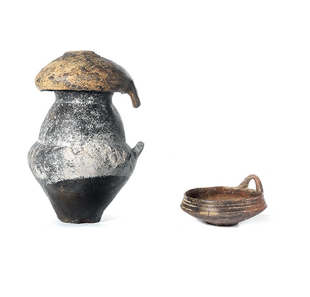 Cinerario con ampio orlo svasato, forma biconica con spalla arrotondata decorata solcature verticali, fondo piatto; ansa a bastoncello, impostata obliquamente sulla massima espansione del corpo; ciotola-coperchio in impasto nero lucidato a stecca, labbro rientrante, vasca carenata, piede a disco, ansa a bastoncello verticale sull'orlo; altra ciotola-coperchio in impasto bruno lucidato a stecca, labbro rientrante decorato da tre solcature, vasca carenata, piede a disco, ansa a bastoncello verticale sull'orlo (3)