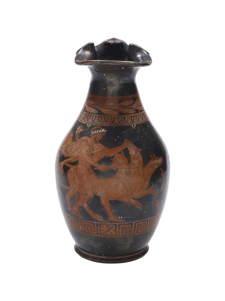 DECORAZIONE: sul ventre la rappresentazione della dodicesima fatica di Eracle, caratterizzato dal leontè e clava che lotta contro il cane a tre teste, Cerbero; ai lati della scena figurata arbusti che indicano lo svolgimento all'aperto e al di sopra della scena un kyma ionico e un tralcio di olivo orizzontale mentre al di sotto si trova un meandro interrotto da motivo a croce