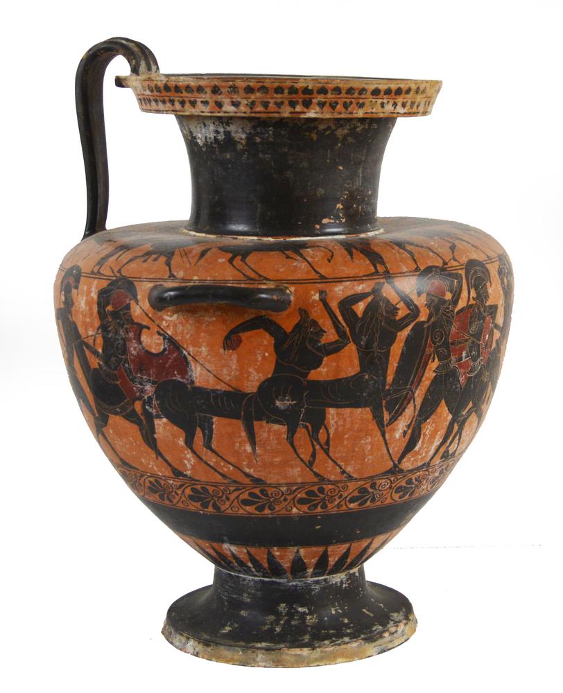 Hydria decorata sul labbro con foglie d'edera cuoriformi; sulla spalla con processione di guerrieri, cavalieri e due pegasi, sul corpo con scena di combattimento fra guerrieri greci e centauri; nella parte inferiore catena di palmette e motivo a raggiera