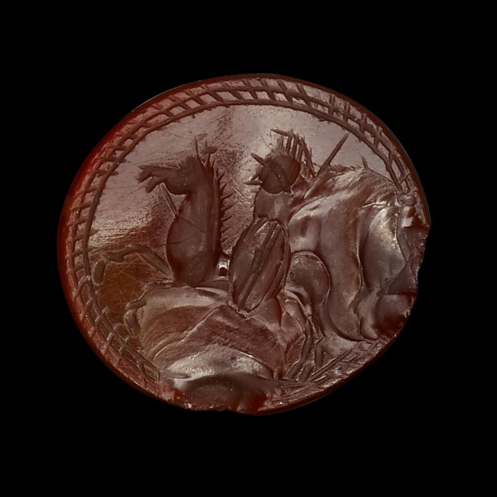 Castone quasi circolare inciso con cavaliere al galoppo verso sinistra con elmo, lancia e scudo. Bordo decorato con doppia linea a tratti diagonali