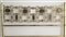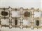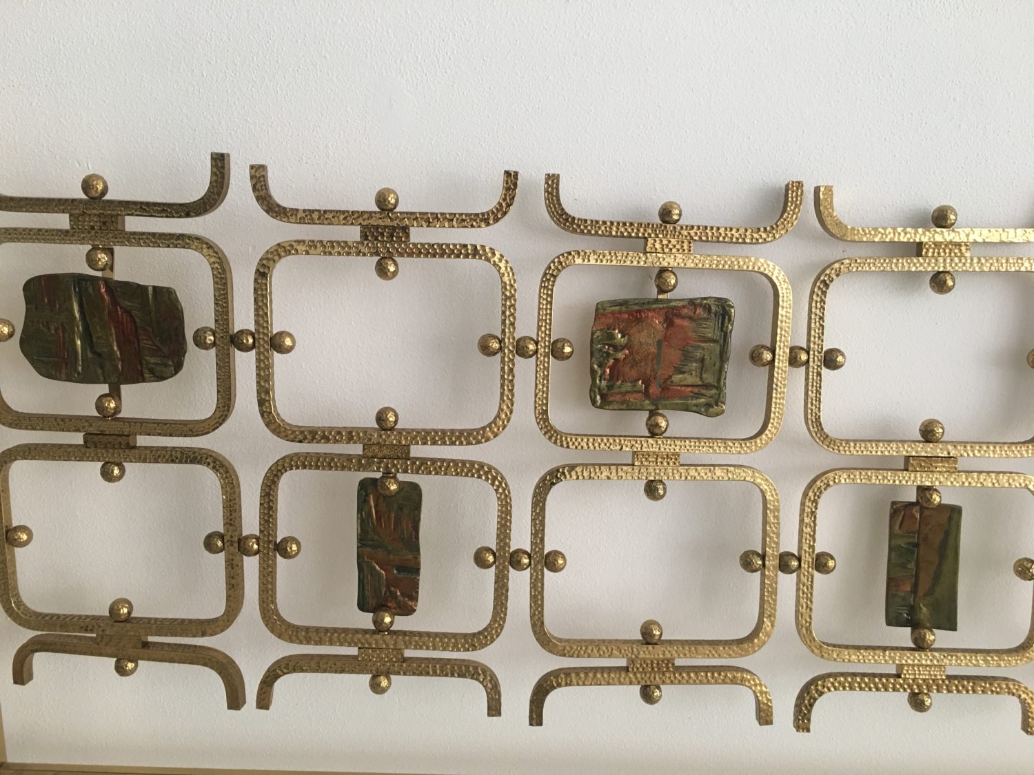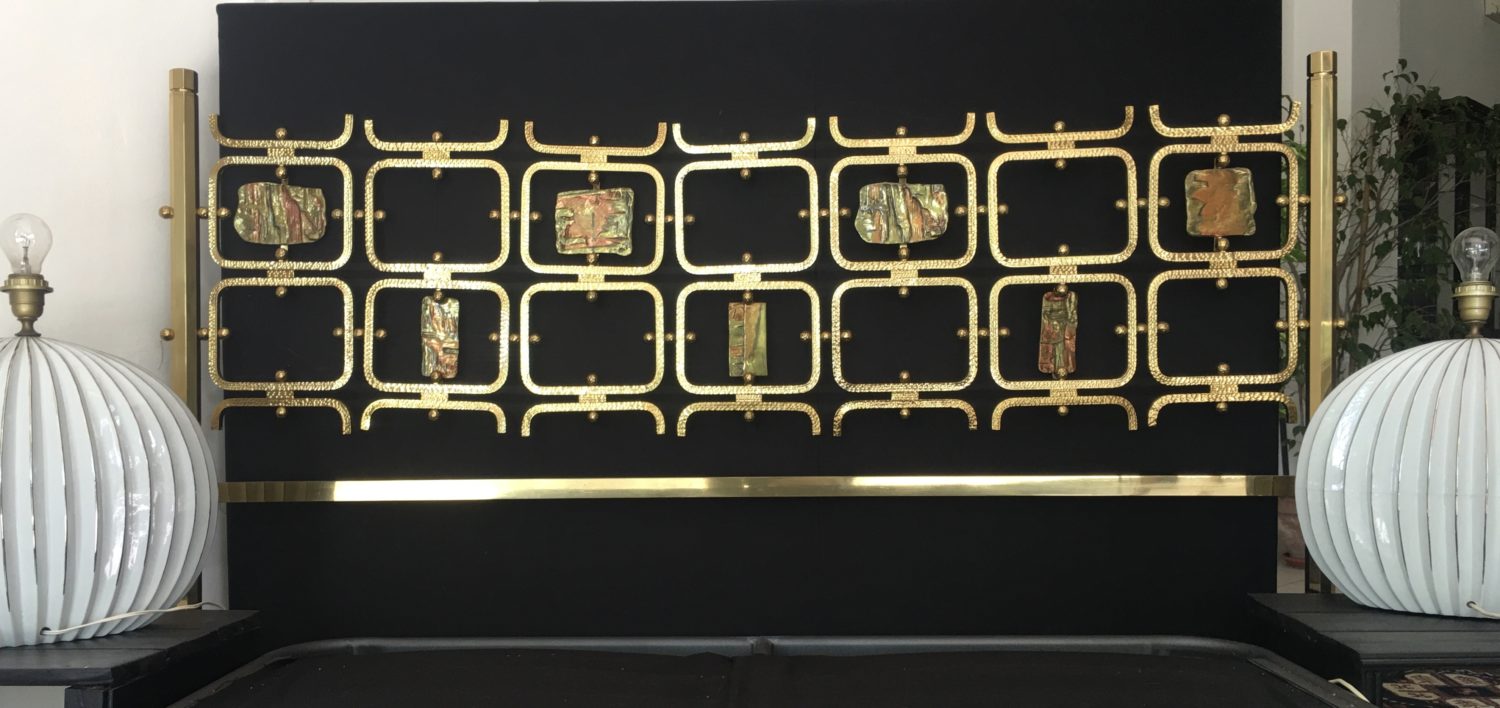 La testiera è composta da telai di elementi modulari in ottone con incastonate delle formelle incise, produzione Tecno, prodotti dal 1958 al 1962.