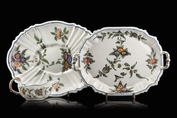 Manifattura veneta, secolo XVIII. Lotto composto da un vassoio biansato, uno di forma ovale ed una salsiera in maiolica decorata in policromia a fiori e foglie sparsi (difetti)