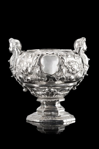 Incensiere in argento con anse decorate a tutto tondo a cherubini alati, corpo sbalzato e cesellato a fiori e volute, base ottagonale con foglie d'acanto ed elementi geometrici. Napoli, fine secolo XVII. Argentiere Giuseppe Simioli (cm 15x16x12) (g 600)