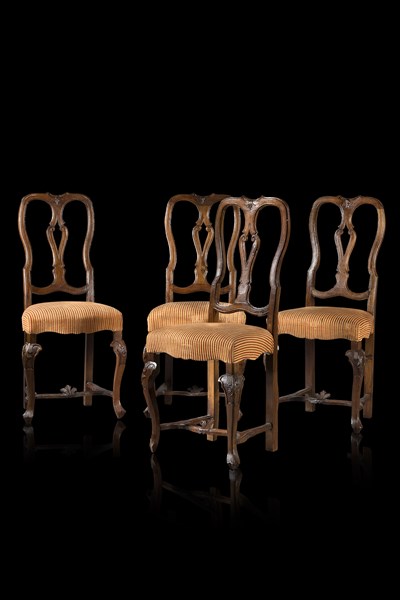Gruppo di quattro sedie in noce intagliato con schienale traforato a volute fogliate, gambe anteriori mosse riunite da traverse. Veneto, secolo XVIII (restauri)