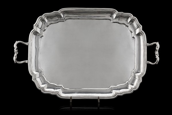 Vassoio in argento biansato con bordo mistilineo e scanalato. Anse sagomate a motivi vegetali. Stato Pontificio, secolo XIX (cm 55x36) (g 1600 ca.)