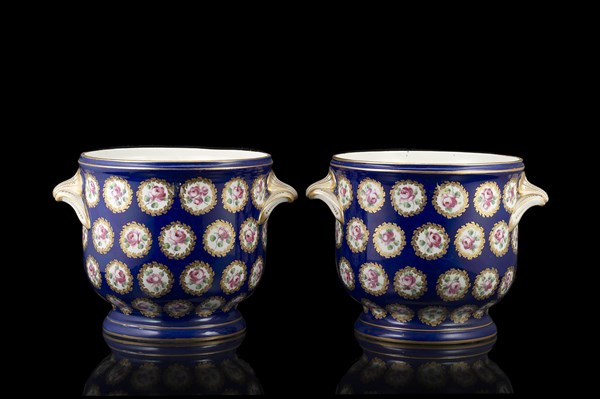 Manifattura francese, secolo XIX. Coppia di rinfrescatoi biansati in porcellana a fondo blu decorati a medaglioni con rose in policromia entro cornici con foglie d'alloro dorate. Marca di fabbrica alle basi (h. cm 16 x d. cm 17,5) (lievi difetti)