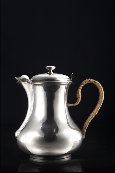 Teiera in argento con corpo piriforme e ansa rivestita in paglia. Ferrara, seco