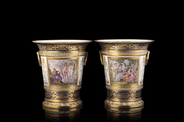 Manifattura francese, prima metà secolo XIX. Coppia di vasi biansati in porcellana decorata in policromia e grisaille a scene classiche entro cornici dorate a fregi e fiori. Fasce profilate in blu e decorate a foglie d'acanto. Anse squadrate. Basi decorate con motivi ad onda stilizzata (h. cm 20) (difetti)