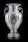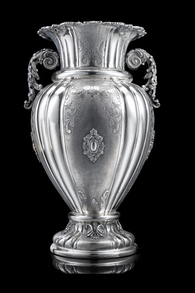 Vaso biansato in argento su base circolare con corpo costolato inciso a motivi vegetali e decorato in rilievo da fregi a volute fogliate. Anse mosse traforate a motivi vegetali. Milano, 194 ca. (h. cm 37,5) (g 2000 ca.)