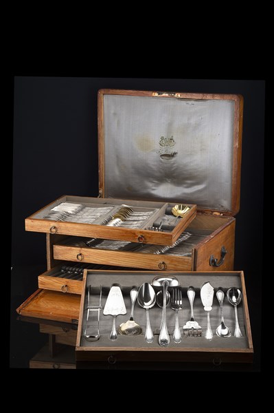 Servizio di posate in argento composto da: diciannove posate da portata e due da arrosto, quattro cucchiaini da sale, dodici cucchiai grandi e dodici piccoli, dodici forchette piccole e ventiquattro grandi, dodici forchette e dodici coltelli da pesce, dodici cucchiaini e dodici palettine da gelato, ventiquattro coltelli grandi e dodici coltelli piccoli. Cifrato "GO". Titolo 800 (g tot. 5700 ca.) In scatola in legno