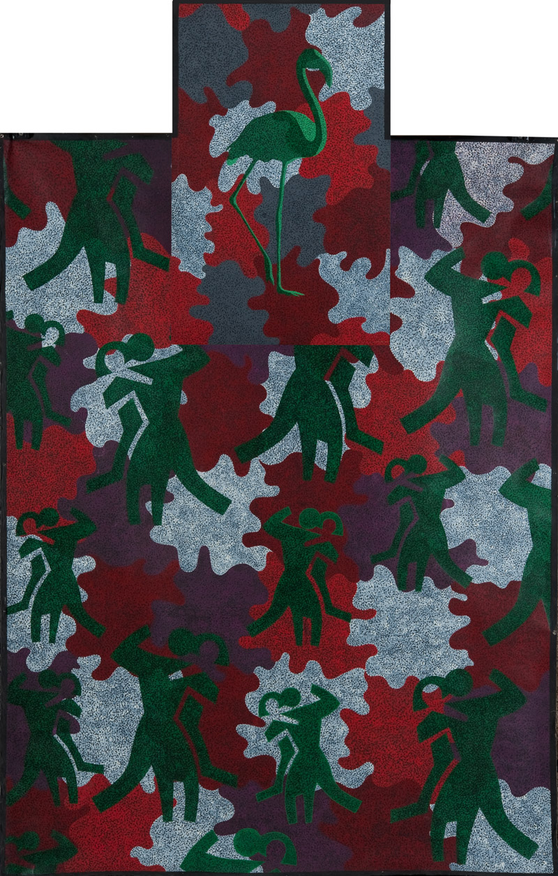 Felice Levini (Roma 1956) “Il ballo della gru” 1987 tecnica mista su tavola inserita su tela dipinta (cm 200x150) (la tavola: cm 90x60) Firmato al retro