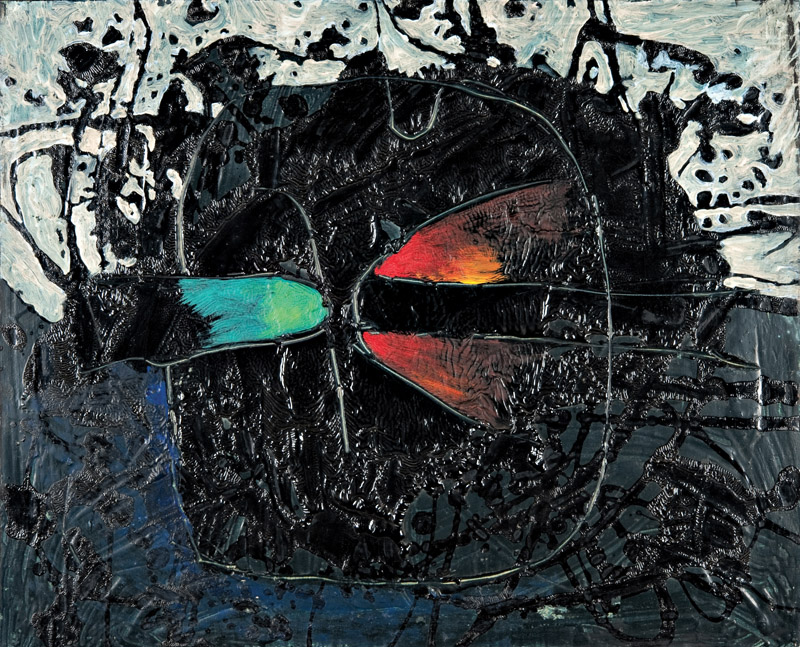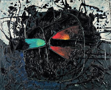 Gianni Dova (Roma 1925 ‑ Milano 1991) “Fuoco nella foresta al buio” 1954 olio su tela (cm 45x55) Firmato, titolato e datato 1954 al retro