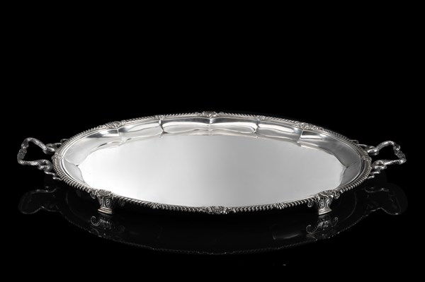 Vassoio di forma ovale in argento decorato nella bordura a foglie d'acanto e motivi stilizzati. Anse a guisa di serpenti. Sheffield, 1930. Argentiere James Dixon & Sons (g 5600 ca.) (cm 78x51) (lievi difetti)