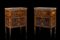 Coppia di comodini lastronati in legni vari e filettati con fronte a due ante. Fronte e fianchi intarsiati a chinoiserie con perlinature, volatili e mostri marini. Piani in marmo (cm 57x75,5x35,5) (difetti, mancanze e restauri, un piano con rotture, l'altro con restauri)