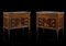 Coppia di cassettoni lastronati in legni vari e filettati. Fronte e fianchi intarsiati a chinoiserie con perlinature, volatili e mostri marini. Gambe a obelisco rovesciato. Piani in marmo. Nella guida di un cassetto reca etichetta cartacea "Canegrate 1801 Gio Perla fece" (cm 98,5x89x49,5) (mancanze e restauri, un piano con rotture)