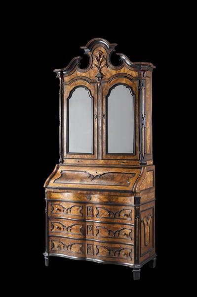 Trumeau lastronato in noce e radica, profili ebanizzati. Parte superiore di forma architettonica a due ante a specchi, parte inferiore a tre cassetti e mezzo e anta ribaltabile celante cassettini. Lombardia, secolo XVIII (cm 110x240x53) (lievi restauri)