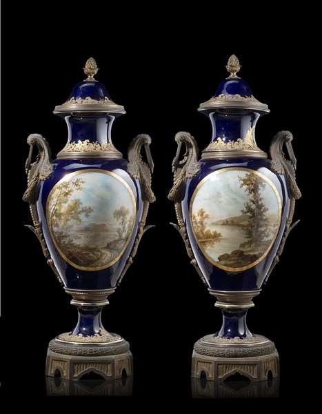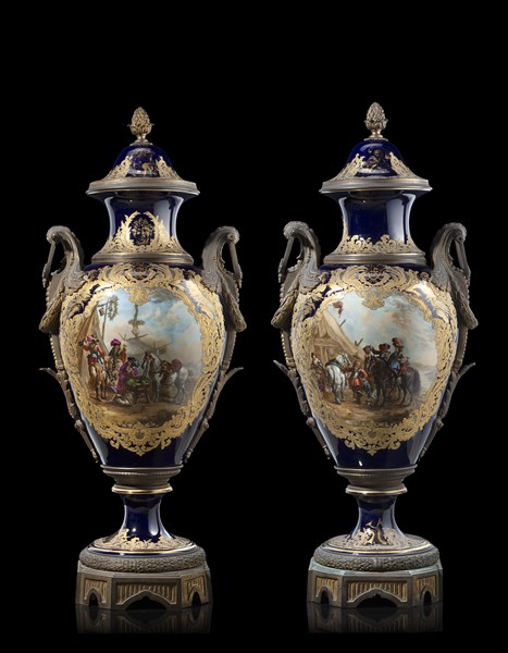 Manifattura francese, fine secolo XIX - inizio secolo XX. Coppia di vasi con coperchio in porcellana a fondo blu cobalto, corpo a balaustro centrato da cartelle entro riserve di foglie e fiori dorate che incorniciano scene di battaglia sul fronte, firmate "Wouvermans", e paesaggi al retro. Anse, presa del coperchio e base in bronzo. Marcati all'interno dei coperchi (h. cm 106) (difetti)