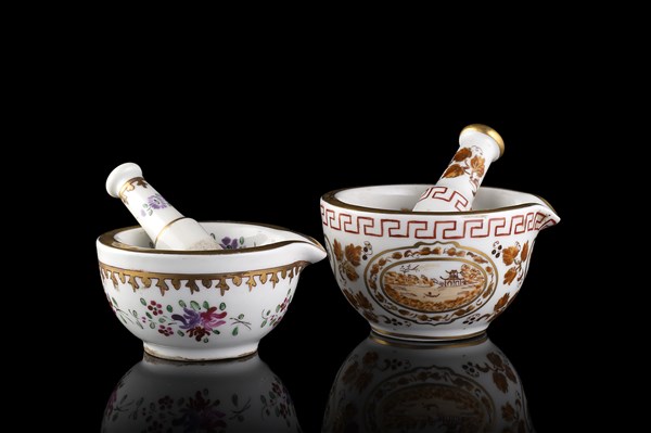 18th and 19th centuries manufactures. Two small polychrome decorated porcelain mortars with pestles (h. cm 5,5; h. cm 4,5) (minor defects)