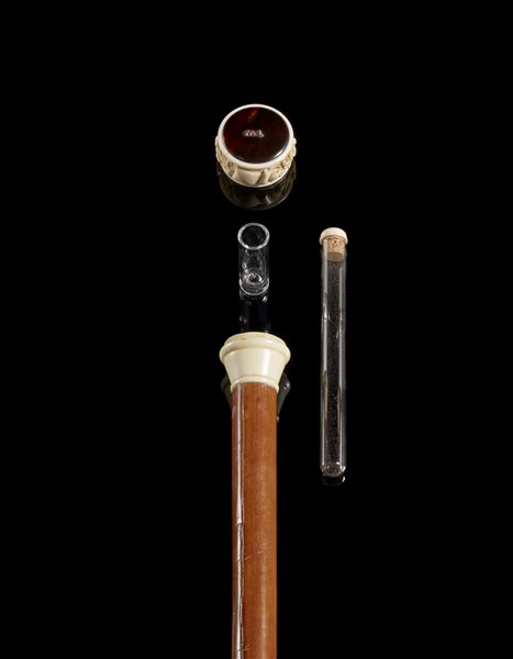 Bastone con canna in malacca e impugnatura in avorio scolpita nella fascia a ghiande e foglie. Coperchio in tartaruga con cifre "M.L.", in oro basso celante fiasca e bicchierino in vetro. Secolo XIX (difetti)
