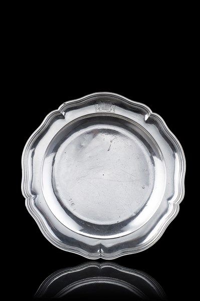 Piatto in argento con bordo scanalato inciso nella bordura con stemma nobiliare