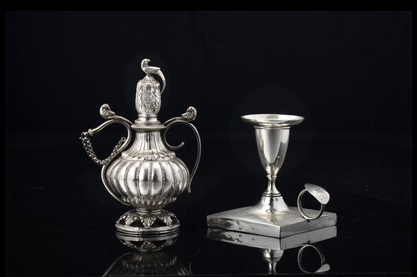 Lotto composto da una bugia e un porta profumi orientale in argento di epoche diverse (g 320 ca.) (difetti)