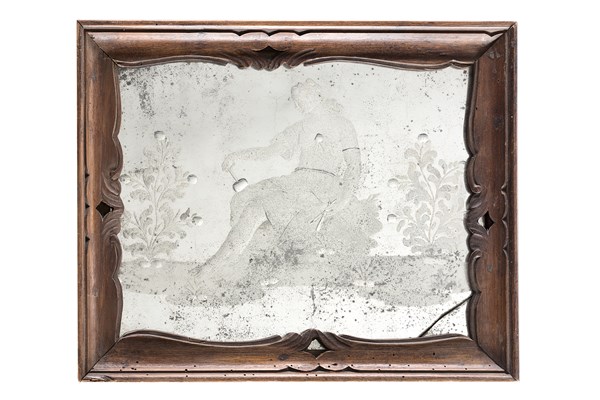 Arte veneta, secolo XVIII. Specchio inciso con divinità classica tra alberi da frutta, in cornice antica (cm 27,5x21,5) (restauri)