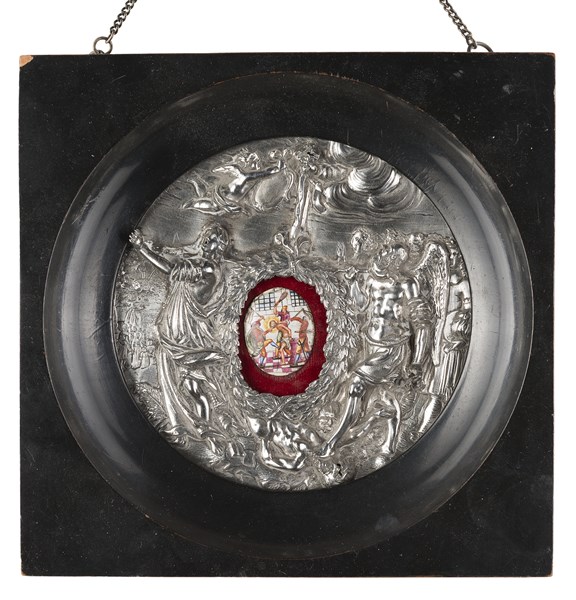 Placca in argento sbalzato e cesellato a scena allegorica, fine secolo XVIII (d. cm 13,5) contenente una placchetta non coeva in rame smaltato raffigurante la Flagellazione di Cristo (difetti)