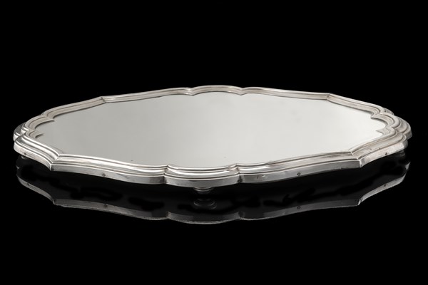 Centrotavola in argento con bordo mistilineo scanalato e fondo a specchio (cm 47x36) (lievi difetti)
