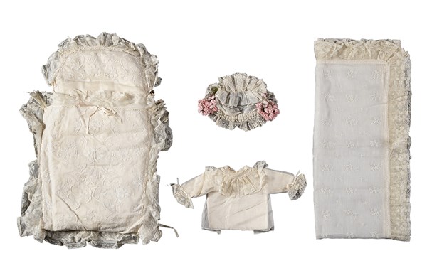 Parure da battesimo composta da cuscino con coperta, lenzuolino, abitino e cuffietta ornata da mazzi di roselline rosa. La parure è confezionata con organza di seta ricamata con fiori sparsi e balza di pizzo fillet al tombolo. Italia (?), secolo XVIII/XIX