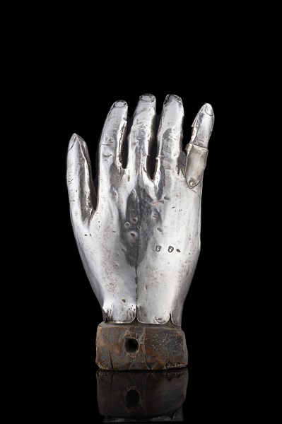 An antique silvered wooden hand. 18th century. Undeciphered hallmarks (l. cm 22) (defects)