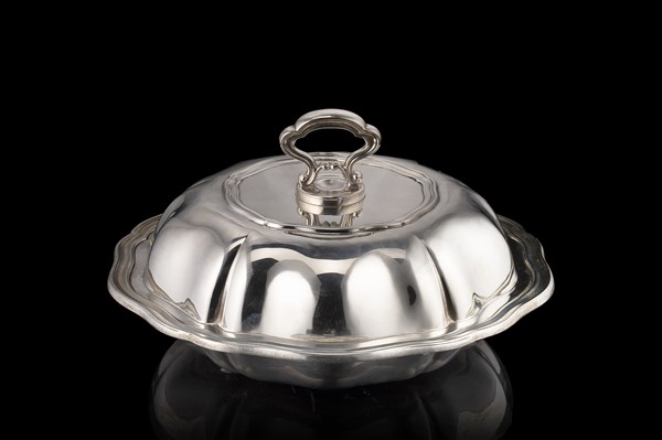 Legumiera con coperchio di forma sagomata in argento a corpo liscio (g 990 ca.)