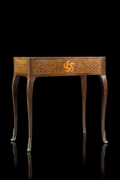Tavolino da centro decorato a motivi geometrici, fasce decorate a motivi fogliati, cassetti laterali. Quattro gambe mosse. Francia, fine secolo XIX (cm 70x72,5x36,5) (difetti)