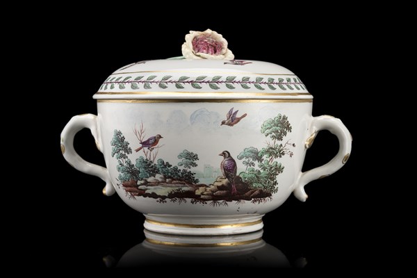 Manifattura della fine del secolo XVIII. Tazza da puerpera biansata con coperchio in porcellana decorata in policromia a paesaggi e volatili. Presa a foggia di fiore, profili dorati (h. cm 13) (lievi difetti)