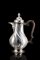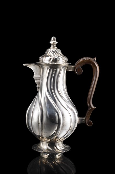 Caffettiera in argento con base circolare e corpo a torchon con ansa sagomata a ricciolo