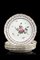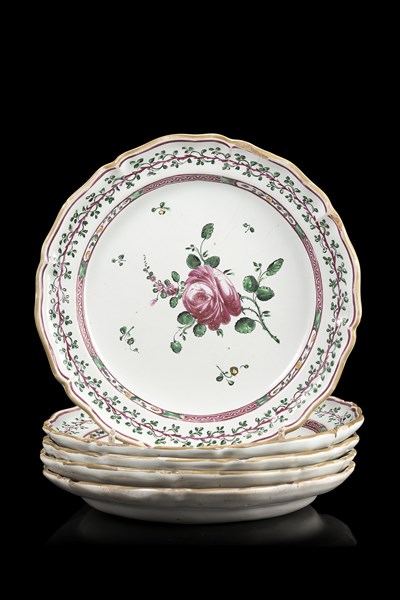 Manifattura italiana, secolo XVIII. Gruppo di cinque piatti in maiolica con bor