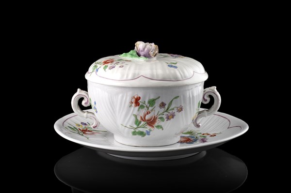 Manifattura del secolo XIX. Tazza da puerpera con coperchio e piattino in porcellana decorata in policromia a mazzi di fiori sparsi, presa del coperchio a forma di fiore a tutto tondo (h. cm 9) (difetti)