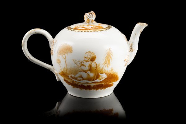 Manifattura di Meissen, secolo XVIII. Piccola teiera in porcellana decorata in ocra e lumeggiata in oro a putti in paesaggi. Presa a guisa di bocciolo (h. cm 7,5) (lievi difetti)