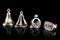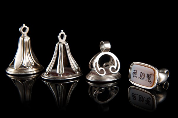 Gruppo di quattro sigilli a pendenti in oro basso cesellato a motivi concatenati e traforati con corniole incise a cifre, motti e stemmi nobiliari. Secolo XIX