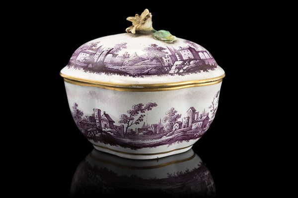 Manifattura del secolo XVIII. Zuccheriera di forma mossa con coperchio in porcellana decorata a paesaggi nei toni del prugna. Bordi dorati, presa a guisa di fiore (h. cm 8) (lievi mancanze e difetti)
