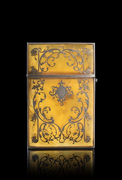 Portabiglietti in tartaruga bionda decorata con inserti a motivi floreali e volute in oro, argento e metalli incisi. Secolo XIX (cm 6x9,5x0.5) (difetti e mancanze)
