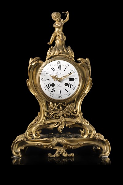 Pendola in bronzo dorato di forma mossa sormontata da figura di cupido