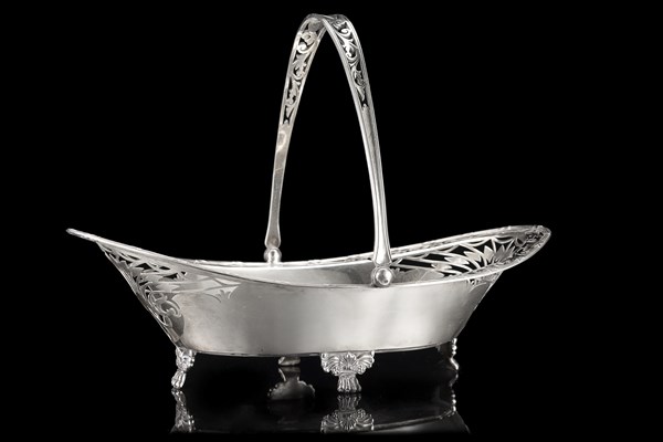 Cestino di forma ovale in argento con anse e bordura traforate a motivi stilizzati e volute, piedi ferini cesellati a foglie e fiori. Sheffield, 1905. Argentiere Marple & Co. (cm 29x9x18) (g 400 ca.)