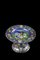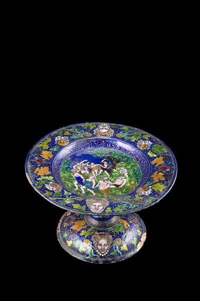 Alzatina in smalti policromi con cavetto centrale decorato con scena di baccanti, bordo a volti e fiori, base tonda con colonnina tornita. Firmata sotto il piatto Francine Perreux. Manifattura francese, secolo XVIII (h. cm 11,5) (mancanze)