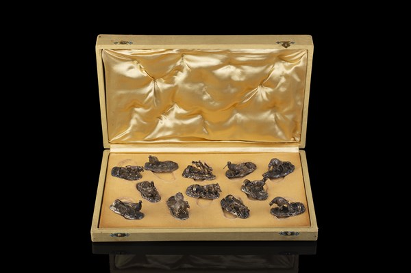 Gruppo di dodici segnaposto in argento dorato raffiguranti animali a tutto tondo poggianti su base con porta biglietto (g 330 ca.) In custodia (lievi difetti)